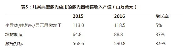 表3是幾類固體激光器的典型應(yīng)用,據(jù)Unlimited Strategy預(yù)測在2016年均出現(xiàn)不同程度的增長。其中增材制造預(yù)測提高的幅度最大,達(dá)24百萬美元,增長率高達(dá)37%;激光打標(biāo)雖增長率僅為3.9%,但因其整體基數(shù)大, 2016年估計將增長了22.2百萬美元;而半導(dǎo)體/電路板/顯示屏預(yù)計增長5.5百萬美元,同比增長5%。 |